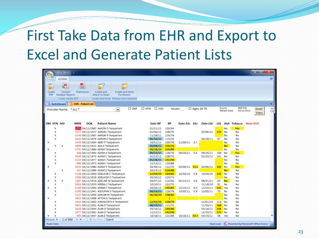 First Take Data from EHR and Export to Excel and Generate Patient Lists
