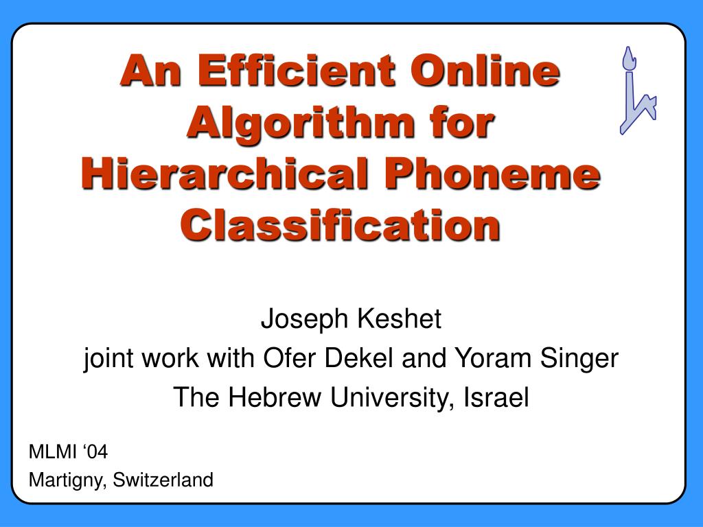 An Efficient Online Algorithm for Hierarchical Phoneme Classification Joseph Keshet joint work with Ofer Dekel and Yoram Singer The Hebrew University, Israel MLMI ‘04 Martigny, Switzerland