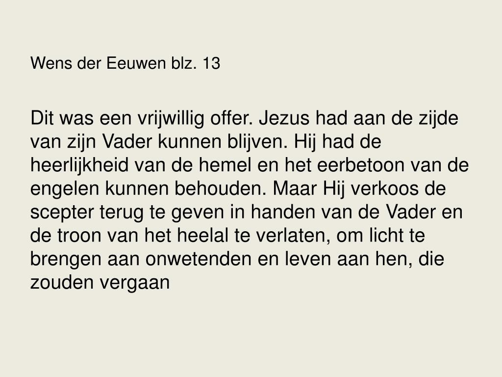 Wens der Eeuwen blz. 13 Dit was een vrijwillig offer. Jezus had aan de zijde van zijn Vader kunnen blijven. Hij had de heerlijkheid van de hemel en het eerbetoon van de engelen kunnen behouden. Maar Hij verkoos de scepter terug te geven in handen van de Vader en de troon van het heelal te verlaten, om licht te brengen aan onwetenden en leven aan hen, die zouden vergaan