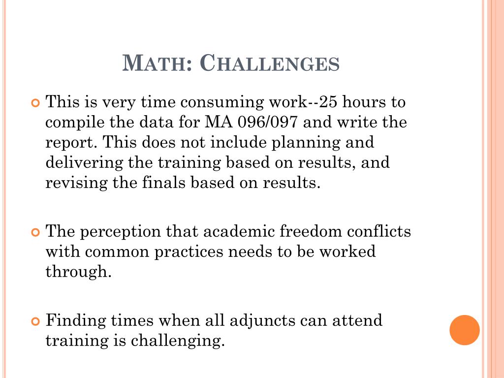 Math: Challenges • This is very time consuming work--25 hours to compile the data for MA 096/097 and write the report. This does not include planning and delivering the training based on results, and revising the finals based on results. • The perception that academic freedom conflicts with common practices needs to be worked through. • Finding times when all adjuncts can attend training is challenging.