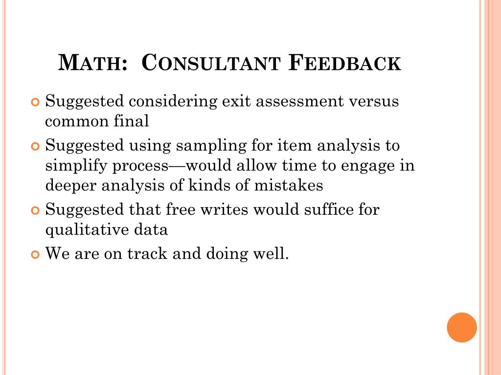 Math: Consultant Feedback • Suggested considering exit assessment versus common final • Suggested using sampling for item analysis to simplify process—would allow time to engage in deeper analysis of kinds of mistakes • Suggested that free writes would suffice for qualitative data • We are on track and doing well.
