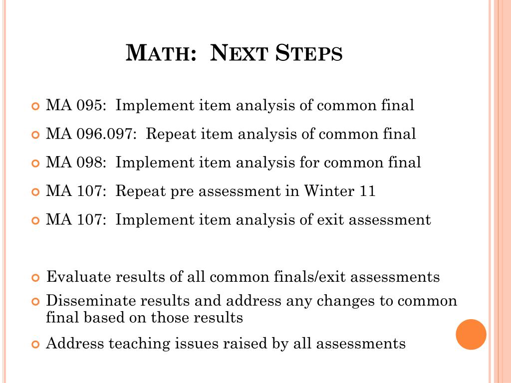 Math: Next Steps • MA 095: Implement item analysis of common final • MA 096.097: Repeat item analysis of common final • MA 098: Implement item analysis for common final • MA 107: Repeat pre assessment in Winter 11 • MA 107: Implement item analysis of exit assessment • Evaluate results of all common finals/exit assessments • Disseminate results and address any changes to common final based on those results • Address teaching issues raised by all assessments