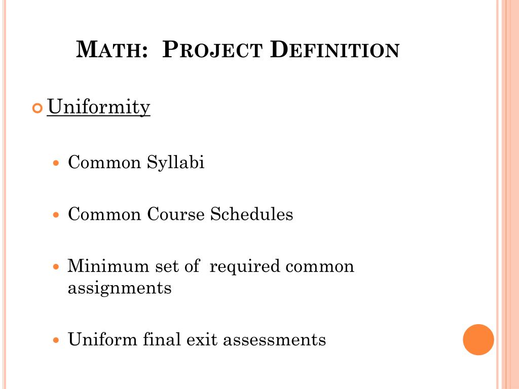 Math: Project Definition • Uniformity • Common Syllabi • Common Course Schedules • Minimum set of required common assignments • Uniform final exit assessments