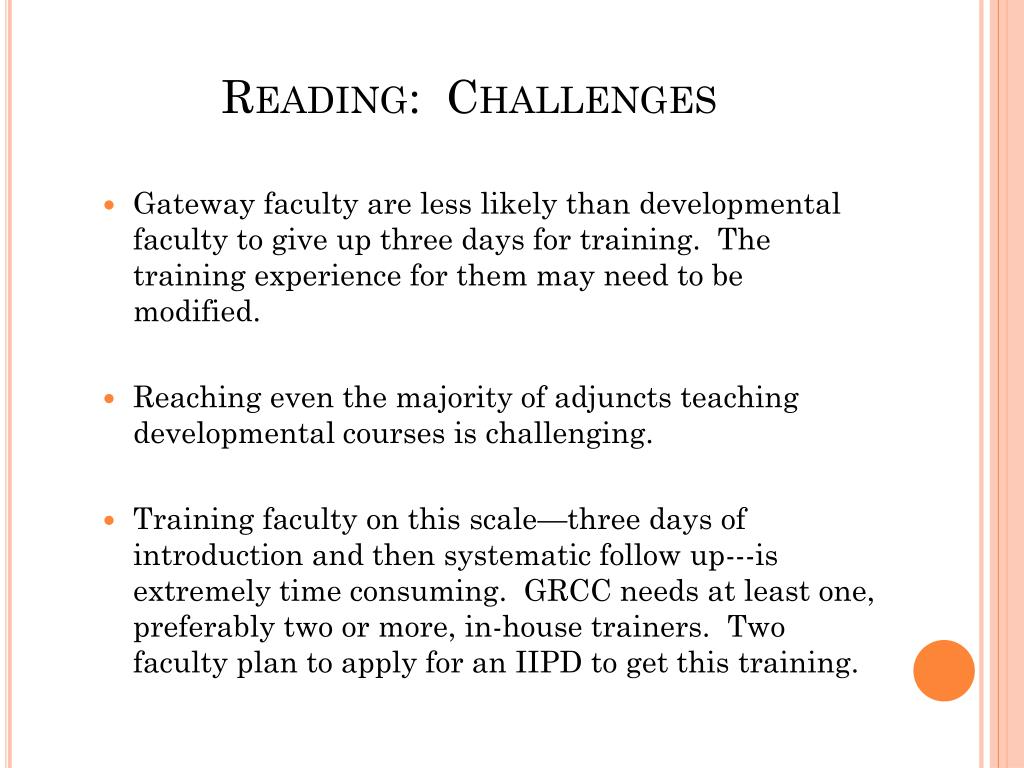 Reading: Challenges • Gateway faculty are less likely than developmental faculty to give up three days for training. The training experience for them may need to be modified. • Reaching even the majority of adjuncts teaching developmental courses is challenging. • Training faculty on this scale—three days of introduction and then systematic follow up---is extremely time consuming. GRCC needs at least one, preferably two or more, in-house trainers. Two faculty plan to apply for an IIPD to get this training.