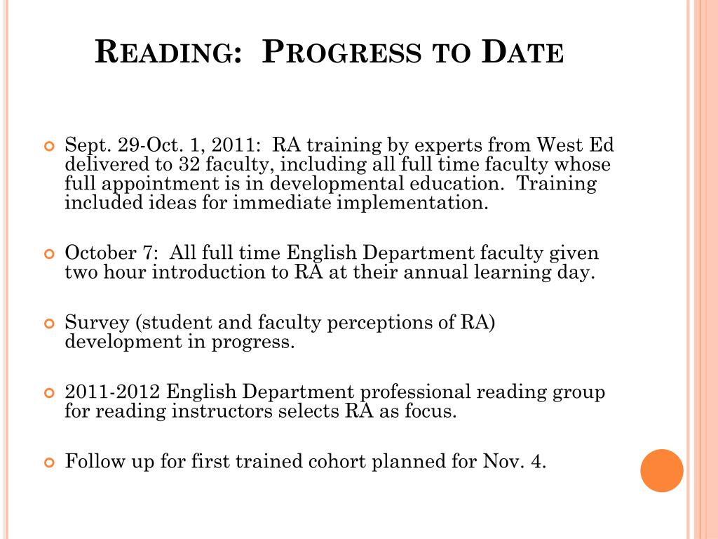 Reading: Progress to Date • Winter 2011: Introduction to RA delivered at AFP learning day • Winter 2011: Reading faculty given more in-depth introduction to RA • August 2011: All reading adjuncts given three hours of training in RA • Sept. 29-Oct. 1, 2011: RA training by experts from West Ed delivered to 32 faculty, including all full time faculty whose full appointment is in developmental education. Training included ideas for immediate implementation