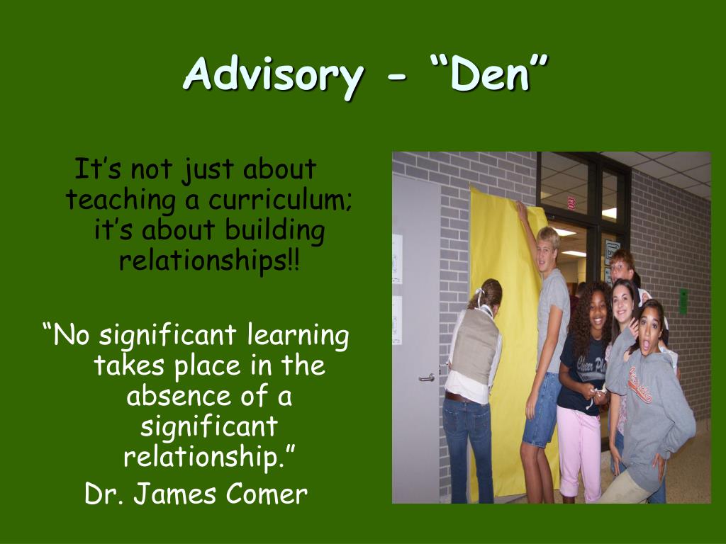 Advisory - “Den” It’s not just about teaching a curriculum; it’s about building relationships!! “No significant learning takes place in the absence of a significant relationship.” Dr. James Comer