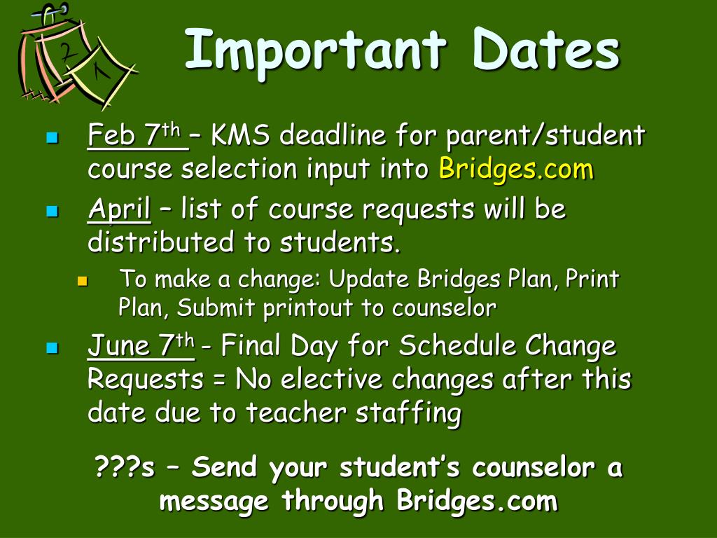 Important Dates Feb 7th– KMS deadline for parent/student course selection input into Bridges.com April – list of course requests will be distributed to students. To make a change: Update Bridges Plan, Print Plan, Submit printout to counselor June 7th- Final Day for Schedule Change Requests = No elective changes after this date due to teacher staffing ???s – Send your student’s counselor a message through Bridges.com