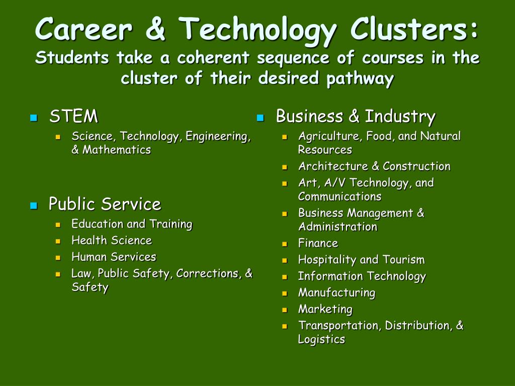 Career & Technology Clusters:Students take a coherent sequence of courses in the cluster of their desired pathway • STEM • Science, Technology, Engineering, & Mathematics • Public Service • Education and Training • Health Science • Human Services • Law, Public Safety, Corrections, & Safety • Business & Industry • Agriculture, Food, and Natural Resources • Architecture & Construction • Art, A/V Technology, and Communications • Business Management & Administration • Finance • Hospitality and Tourism • Information Technology • Manufacturing • Marketing • Transportation, Distribution, & Logistics