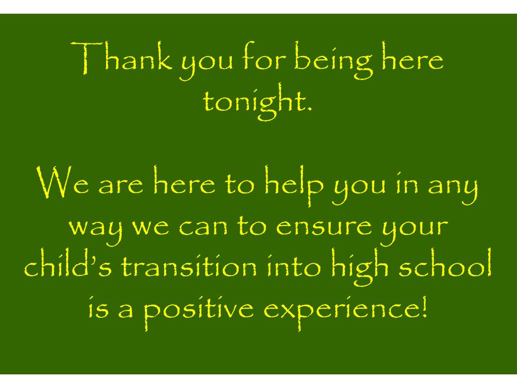 Thank you for being here tonight. We are here to help you in any way we can to ensure your child’s transition into high school is a positive experience!