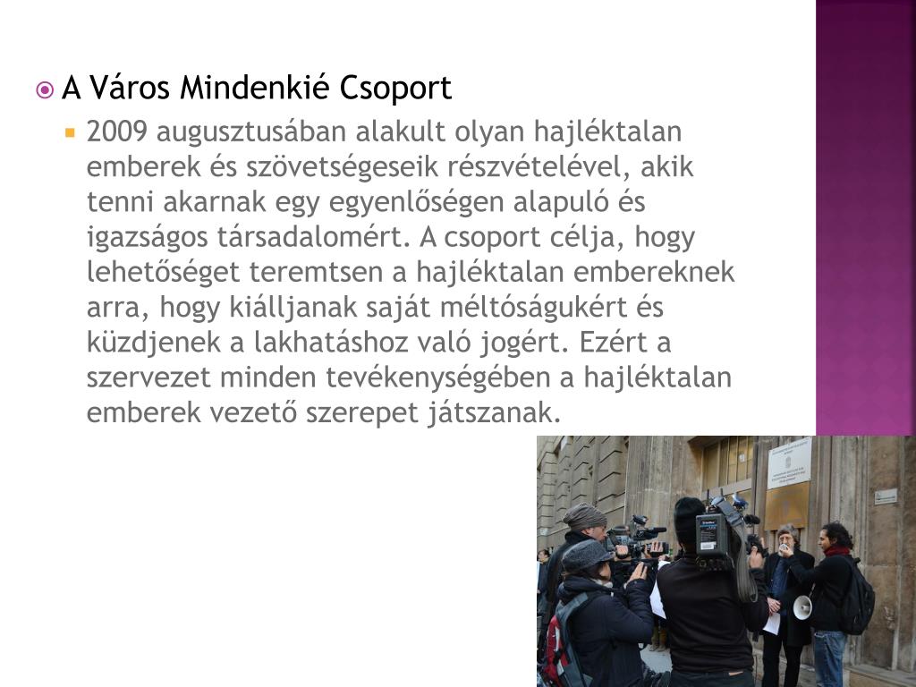 A Város Mindenkié Csoport • 2009 augusztusában alakult olyan hajléktalan emberek és szövetségeseik részvételével, akik tenni akarnak egy egyenlőségen alapuló és igazságos társadalomért. A csoport célja, hogy lehetőséget teremtsen a hajléktalan embereknek arra, hogy kiálljanak saját méltóságukért és küzdjenek a lakhatáshoz való jogért. Ezért a szervezet minden tevékenységében a hajléktalan emberek vezető szerepet játszanak.
