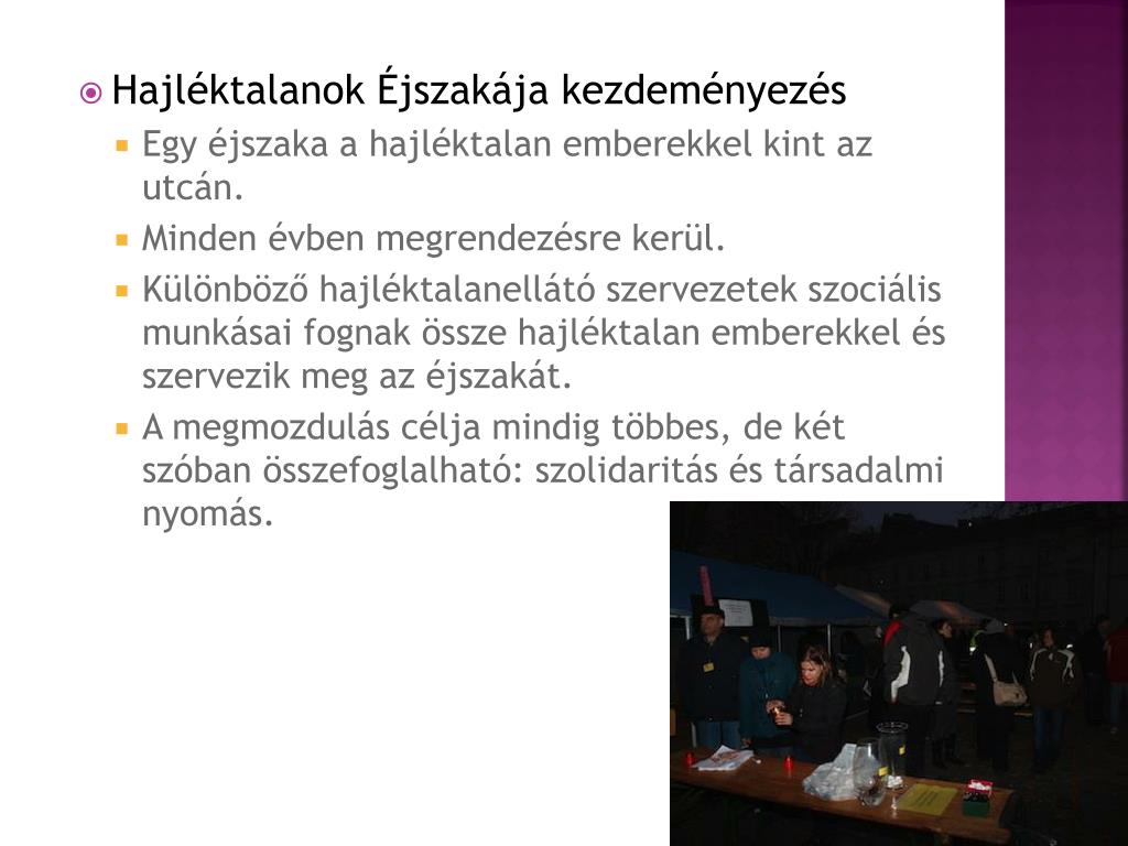 Hajléktalanok Éjszakája kezdeményezés • Egy éjszaka a hajléktalan emberekkel kint az utcán. • Minden évben megrendezésre kerül. • Különböző hajléktalanellátó szervezetek szociális munkásai fognak össze hajléktalan emberekkel és szervezik meg az éjszakát. • A megmozdulás célja mindig többes, de két szóban összefoglalható: szolidaritás és társadalmi nyomás.