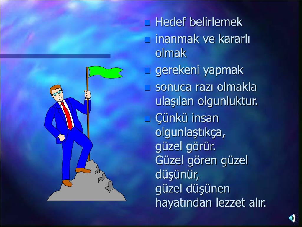 Hedef belirlemek • inanmak ve kararlı olmak • gerekeni yapmak • sonuca razı olmakla ulaşılan olgunluktur. • Çünkü insan olgunlaştıkça, güzel görür. Güzel gören güzel düşünür, güzel düşünen hayatından lezzet alır.