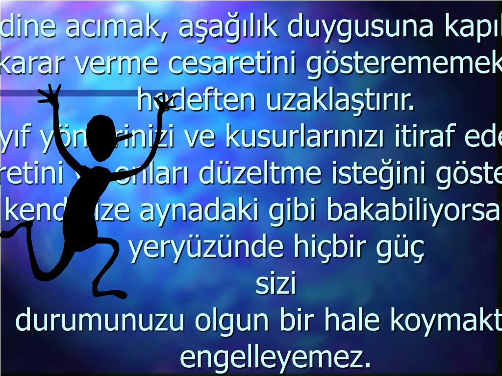 Kendine acımak, aşağılık duygusuna kapılmak ve karar verme cesaretini gösterememek sizi hedeften uzaklaştırır.Zayıf yönlerinizi ve kusurlarınızı itiraf edebilme cüretini ve onları düzeltme isteğini göstererek, kendinize aynadaki gibi bakabiliyorsanız,yeryüzünde hiçbir güç sizidurumunuzu olgun bir hale koymaktanengelleyemez.