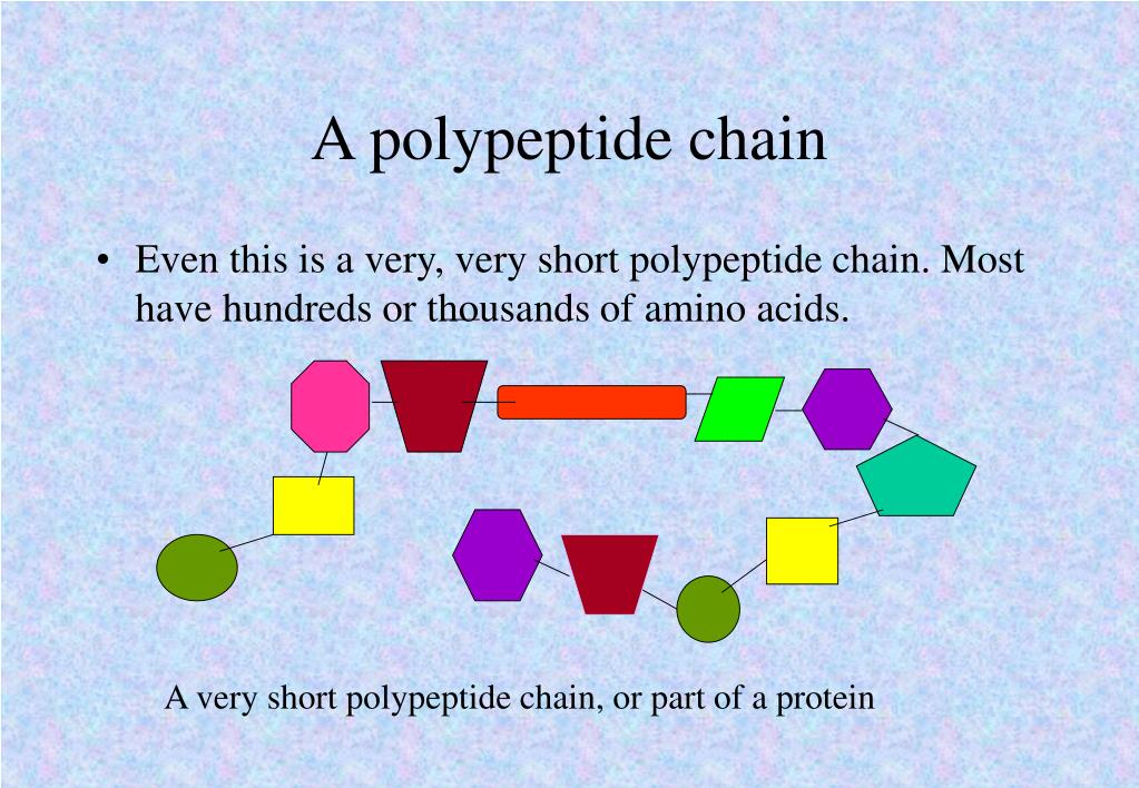 A polypeptide chain • Even this is a very, very short polypeptide chain. Most have hundreds or thousands of amino acids. A very short polypeptide chain, or part of a protein