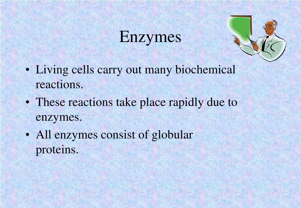 Enzymes • Living cells carry out many biochemical reactions. • These reactions take place rapidly due to enzymes. • All enzymes consist of globular proteins.