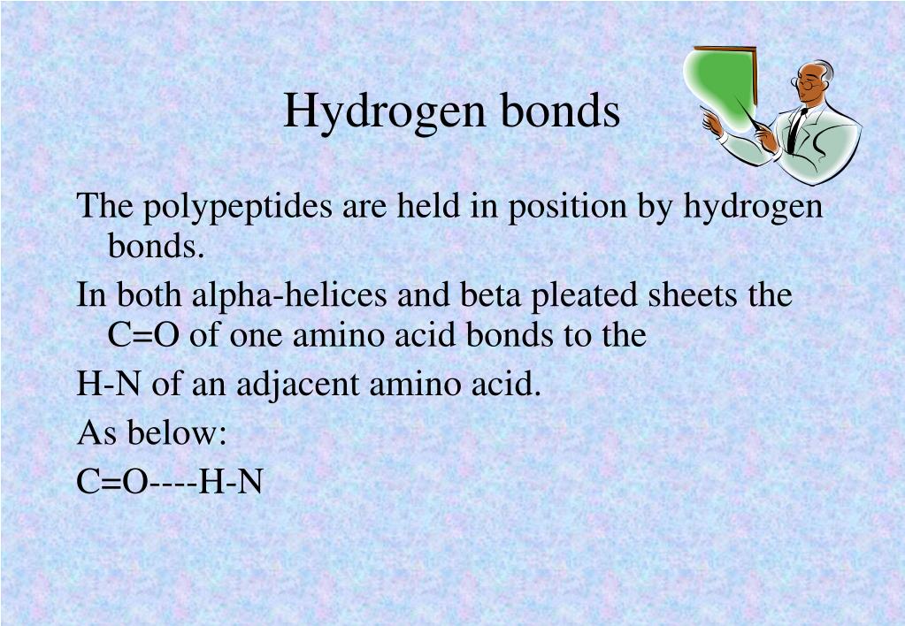 Hydrogen bonds The polypeptides are held in position by hydrogen bonds. In both alpha-helices and beta pleated sheets the C=O of one amino acid bonds to the H-N of an adjacent amino acid. As below: C=O----H-N