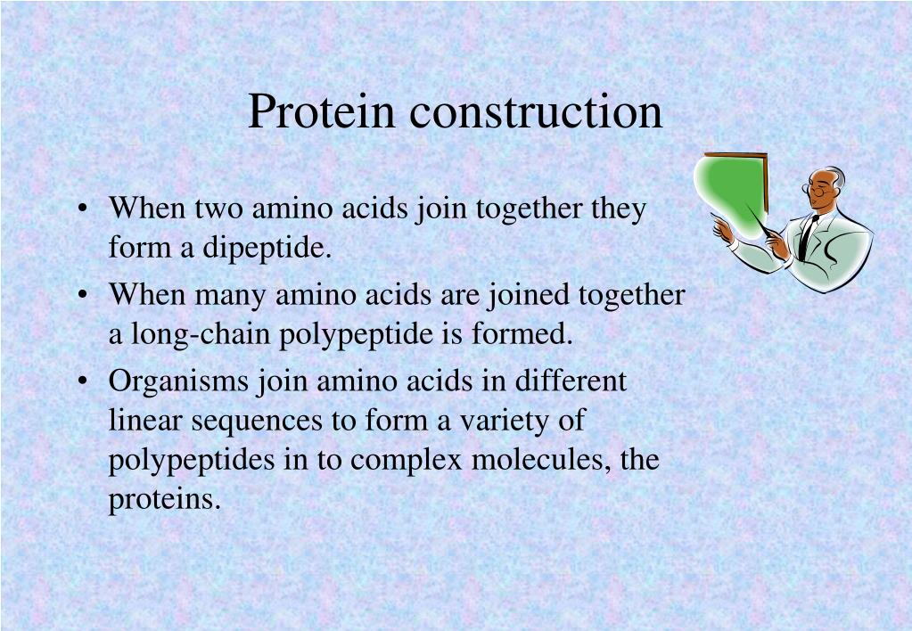 Protein construction • When two amino acids join together they form a dipeptide. • When many amino acids are joined together a long-chain polypeptide is formed. • Organisms join amino acids in different linear sequences to form a variety of polypeptides in to complex molecules, the proteins.