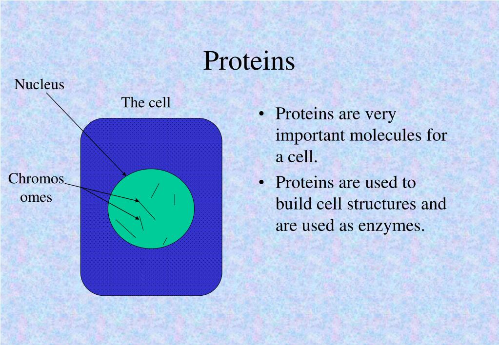 Proteins Nucleus The cell • Proteins are very important molecules for a cell. • Proteins are used to build cell structures and are used as enzymes. Chromosomes