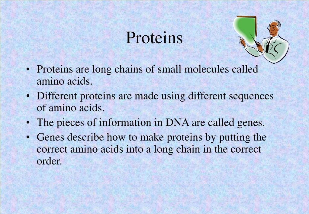 Proteins • Proteins are long chains of small molecules called amino acids. • Different proteins are made using different sequences of amino acids. • The pieces of information in DNA are called genes. • Genes describe how to make proteins by putting the correct amino acids into a long chain in the correct order.
