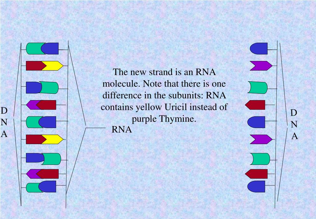 The new strand is an RNA molecule. Note that there is one difference in the subunits: RNA contains yellow Uricil instead of purple Thymine. D N A D N A RNA