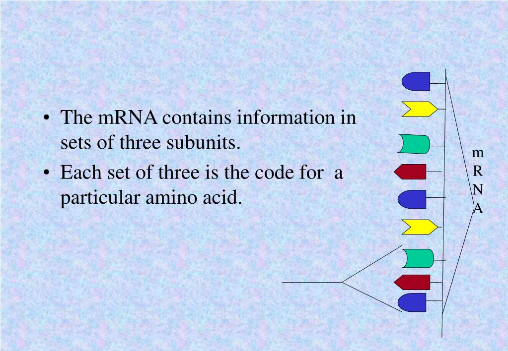 The mRNA contains information in sets of three subunits. • Each set of three is the code for a particular amino acid. m R N A Code for a Particular amino acid