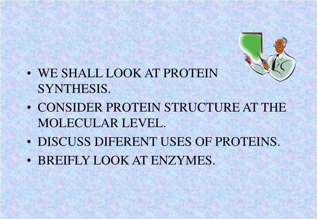 WE SHALL LOOK AT PROTEIN SYNTHESIS. • CONSIDER PROTEIN STRUCTURE AT THE MOLECULAR LEVEL. • DISCUSS DIFERENT USES OF PROTEINS. • BREIFLY LOOK AT ENZYMES.