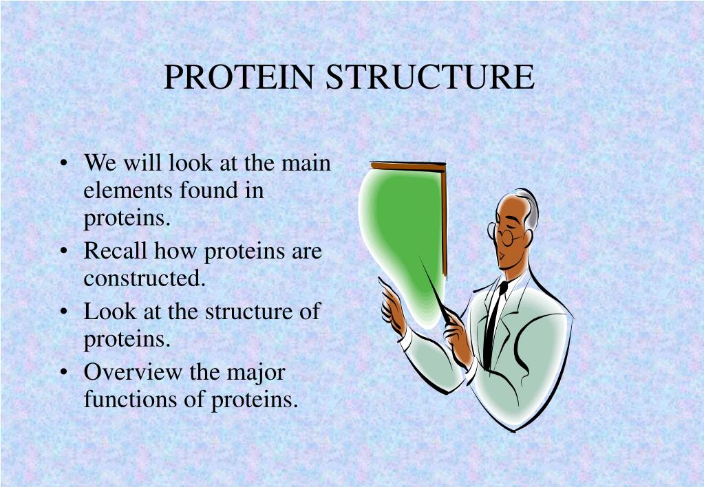 PROTEIN STRUCTURE • We will look at the main elements found in proteins. • Recall how proteins are constructed. • Look at the structure of proteins. • Overview the major functions of proteins.