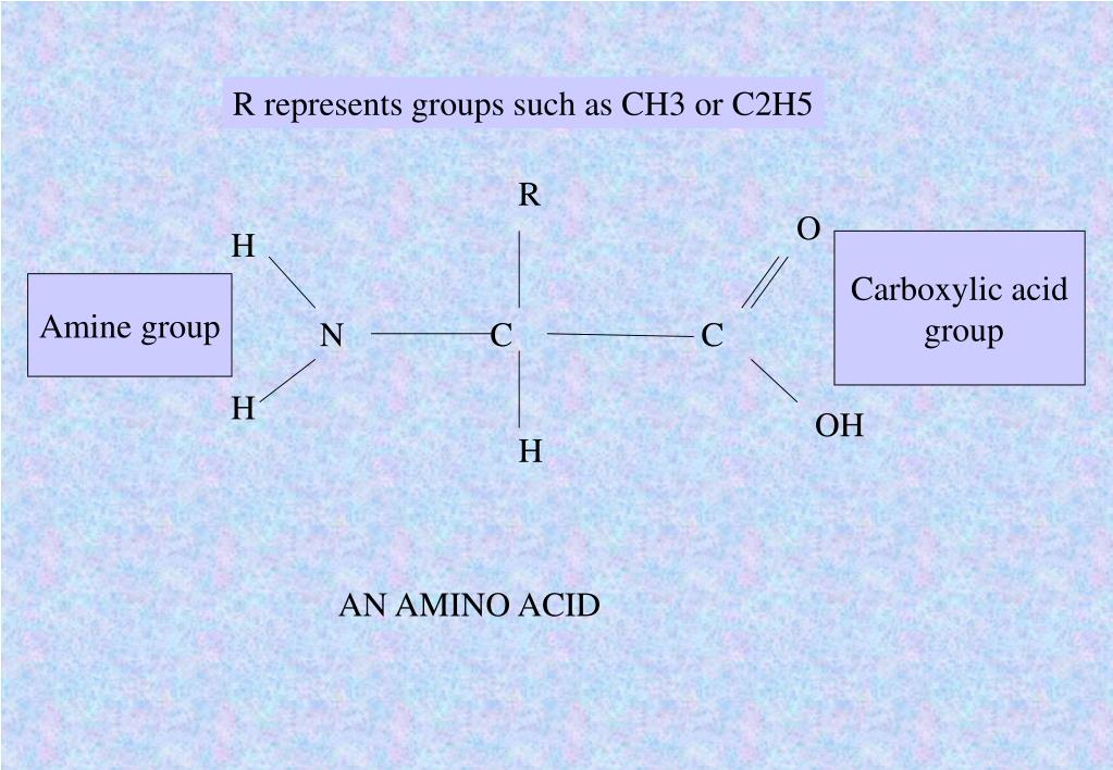 R represents groups such as CH3 or C2H5 R O H Carboxylic acid group Amine group N C C H OH H AN AMINO ACID