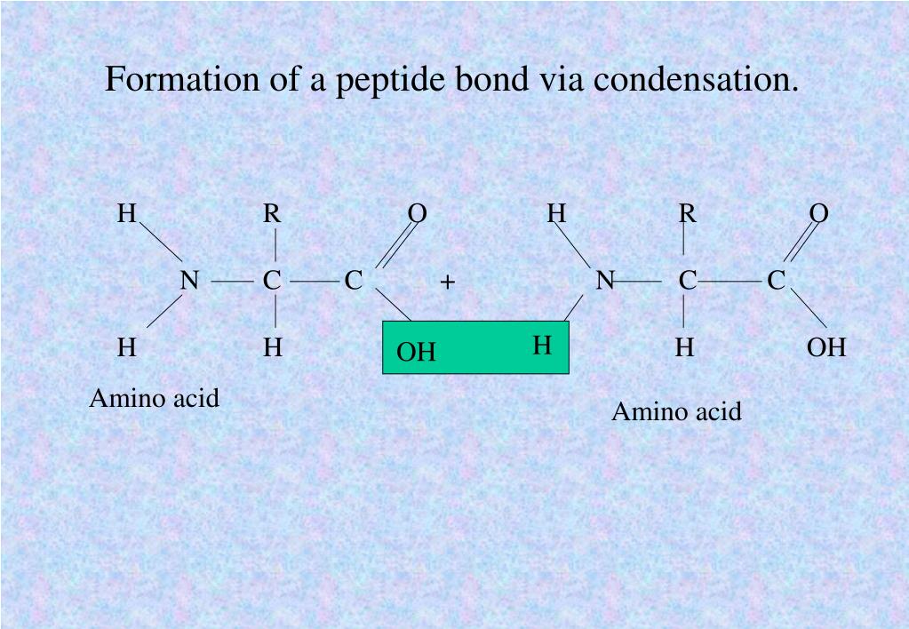 Formation of a peptide bond via condensation. H R O H R O N C C + N C C H H H OH H OH Amino acid Amino acid