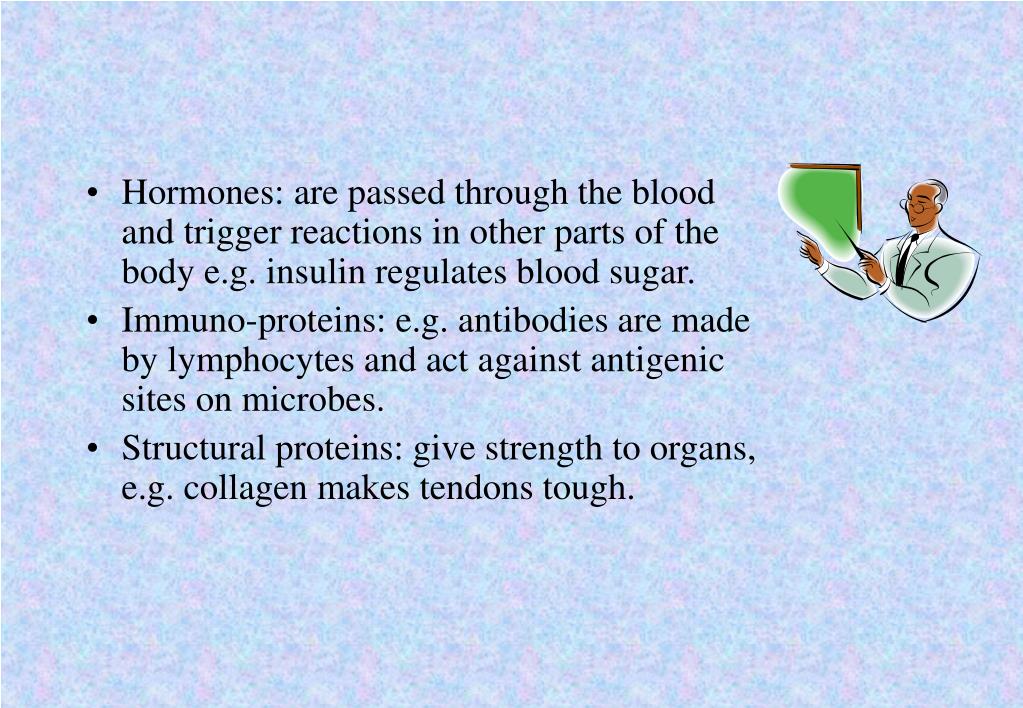 Hormones: are passed through the blood and trigger reactions in other parts of the body e.g. insulin regulates blood sugar. • Immuno-proteins: e.g. antibodies are made by lymphocytes and act against antigenic sites on microbes. • Structural proteins: give strength to organs, e.g. collagen makes tendons tough.