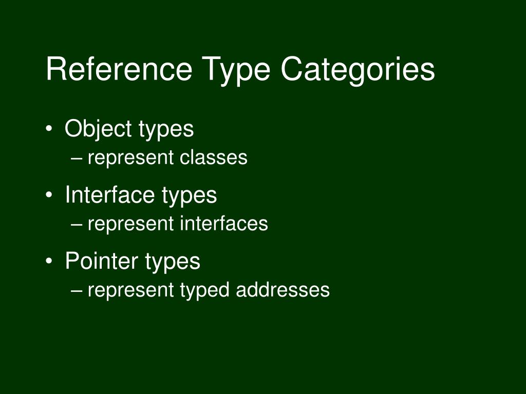 Reference Type Categories • Object types • represent classes • Interface types • represent interfaces • Pointer types • represent typed addresses