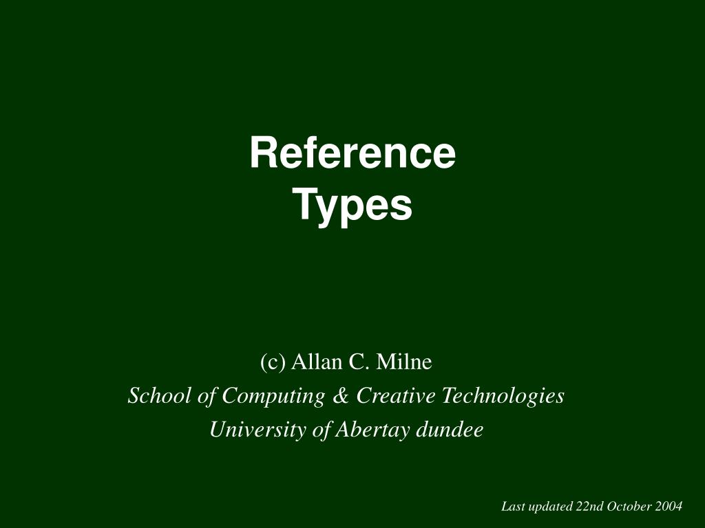Reference Types. (c) Allan C. Milne School of Computing & Creative Technologies University of Abertay dundee. Last updated 22nd October 2004. Agenda. Reference Types Object Types The Object & String Classes Interface types Pointer Types Assignment Compatibility. Reference Types ….