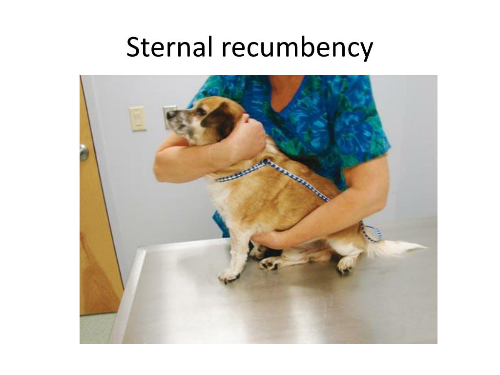 Restraints and Handling. Standing restraint. Sitting Restraint. Sitting restraint of large dog using the wall and handler’s body. Lateral recumbency in small dogs. Lateral recumbancy in large dogs. Sternal recumbency. Sternal Recumbency. Dorsal recumbency.