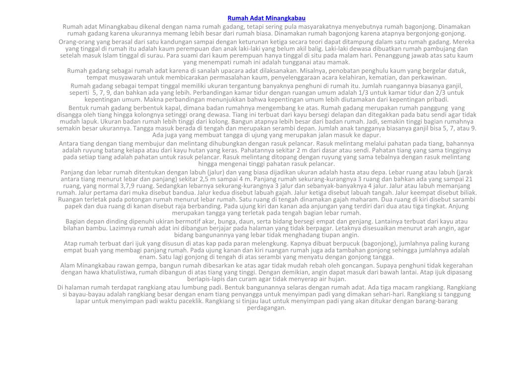 RumahAdatMinangkabau RumahadatMinangkabaudikenaldengannamarumahgadang, tetapisering pula masyarakatnyamenyebutnyarumahbagonjong. Dinamakanrumahgadangkarenaukurannyamemanglebihbesardarirumahbiasa. Dinamakanrumahbagonjongkarenaatapnyabergonjong-gonjong. Orang-orang yang berasaldarisatukandungansampaidenganketurunanketigasecarateoridapatditampungdalamsaturumahgadang. Mereka yang tinggaldirumahituadalahkaumperempuandananaklaki-laki yang belumakilbalig. Laki-lakidewasadibuatkanrumahpambujangdansetelahmasuk Islam tinggaldisurau. Para suamidarikaumperempuanhanyatinggaldi situ padamalamhari. Penanggungjawabatassatukaum yang menempatirumahiniadalahtungganaiataumamak. Rumahgadangsebagairumahadatkarenadisanalahupacaraadatdilaksanakan. Misalnya, penobatanpenghulukaum yang bergelardatuk, tempatmusyawarahuntukmembicarakanpermasalahankaum, penyelenggaraanacarakelahiran, kematian, danperkawinan. Rumahgadangsebagaitempattinggalmemilikiukurantergantungbanyaknyapenghunidirumahitu. Jumlahruangannyabiasanyaganjil, seperti 5, 7, 9, danbahkanada yang lebih. Perbandingankamartidurdenganruanganumumadalah 1/3 untukkamartidurdan 2/3 untukkepentinganumum. Maknaperbandinganmenunjukkanbahwakepentinganumumlebihdiutamakandarikepentinganpribadi. Bentukrumahgadangberbentukkapal, dimanabadanrumahnyamengembangkeatas. Rumahgadangmerupakanrumahpanggung yang disanggaolehtianghinggakolongnyasetinggiorangdewasa. Tianginiterbuatdarikayubersegidelapandanditegakkanpadabatusendi agar tidakmudahlapuk. Ukuranbadanrumahlebihtinggidarikolong. Bangunatapnyalebihbesardaribadanrumah. Jadi, semakintinggibagianrumahnyasemakinbesarukurannya. Tanggamasukberadaditengahdanmerupakanserambidepan. Jumlahanaktangganyabiasanyaganjilbisa 5, 7, atau 9. Adajuga yang membuattanggadiujung yang merupakanjalanmasukkedapur. Antaratiangdengantiangmembujurdanmelintangdihubungkandenganrasukpelancar. Rasukmelintangmelaluipahatanpadatiang, bahannyaadalahruyungbatangkelapaataudarikayuhutan yang keras. Pahatannyasekitar 2 m daridasaratausendi. Pahatantiang yang samatingginyapadasetiaptiangadalahpahatanuntukrasukpelancar. Rasukmelintangditopangdenganruyung yang samatebalnyadenganrasukmelintanghinggamengenaitinggipahatanrasukpelancar. Panjangdanlebarrumahditentukandenganlabuh (jalur) dan yang biasadijadikanukuranadalahhastaataudepa. Lebarruangataulabuh (jarakantaratiangmenurutlebardanpanjang) sekitar 2,5 m sampai 4 m. Panjangrumahsekurang-kurangnya 3 ruangdanbahkanada yang sampai 21 ruang, yang normal 3,7,9 ruang. Sedangkanlebarnyasekurang-kurangnya 3 jalurdansebanyak-banyaknya 4 jalur. Jalurataulabuhmemanjangrumah. Jalurpertamadarimukadisebutbandua. Jalurkeduadisebutlabuahgajah. Jalurketigadisebutlabuahtangah. Jalurkeempatdisebutbiliak. Ruanganterletakpadapotonganrumahmenurutlebarrumah. Saturuangditengahdinamakangajahmaharam. Duaruangdikiridisebutsarambipapekdanduaruangdikanandisebut raja berbanding. Padaujungkiridankananadaanjungan yang terdiridariduaatautigatingkat. Anjungmerupakantangga yang terletakpadatengahbagianlebarrumah. Bagiandepandindingdipenuhiukiranbermotifakar, bunga, daun, sertabidangbersegiempatdangenjang. Lantainyaterbuatdarikayuataubilahanbambu. Lazimnyarumahadatinidibangunberjajarpadahalaman yang tidakberpagar. Letaknyadisesuaikanmenurutarahangin, agar bidangbangunannya yang lebartidakmenghadangtiupanangin. Ataprumahterbuatdariijuk yang disusundiataskappadaparanmelengkung. Kapnyadibuatberpucuk (bagonjong), jumlahnya paling kurangempatbuah yang membagipanjangrumah. Padaujungkanandankiriruanganrumahjugaadatambahangonjongsehinggajumlahnyaadalahenam. Satulagigonjongditengahdiatasserambi yang menyatudengangonjongtangga. AlamMinangkabaurawangempa, bangunrumahdibesarkankeatas agar tidakmudahrebaholehgoncangan. Supayapenghunitidakkegerahandenganhawakhatulistiwa, rumahdibangundiatastiang yang tinggi. Dengandemikian, angindapatmasukdaribawahlantai. Atapijukdipasangberlapis-lapis dancuram agar tidakmenyerap air hujan. Di halamanrumahterdapatrangkiangataulumbungpadi. Bentukbangunannyaselarasdenganrumahadat. Adatigamacamrangkiang. Rangkiangsibayau-bayauadalahrangkiangbesardenganenamtiangpenyanggauntukmenyimpanpadi yang dimakansehari-hari. Rangkiangsitanggunglaparuntukmenyimpanpadiwaktupaceklik. Rangkiangsitinjaulautuntukmenyimpanpadi yang akanditukardenganbarang-barangperdagangan.