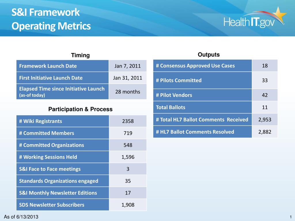 S&I Framework Operating Metrics Outputs Timing Participation & Process As of 6/13/2013 1