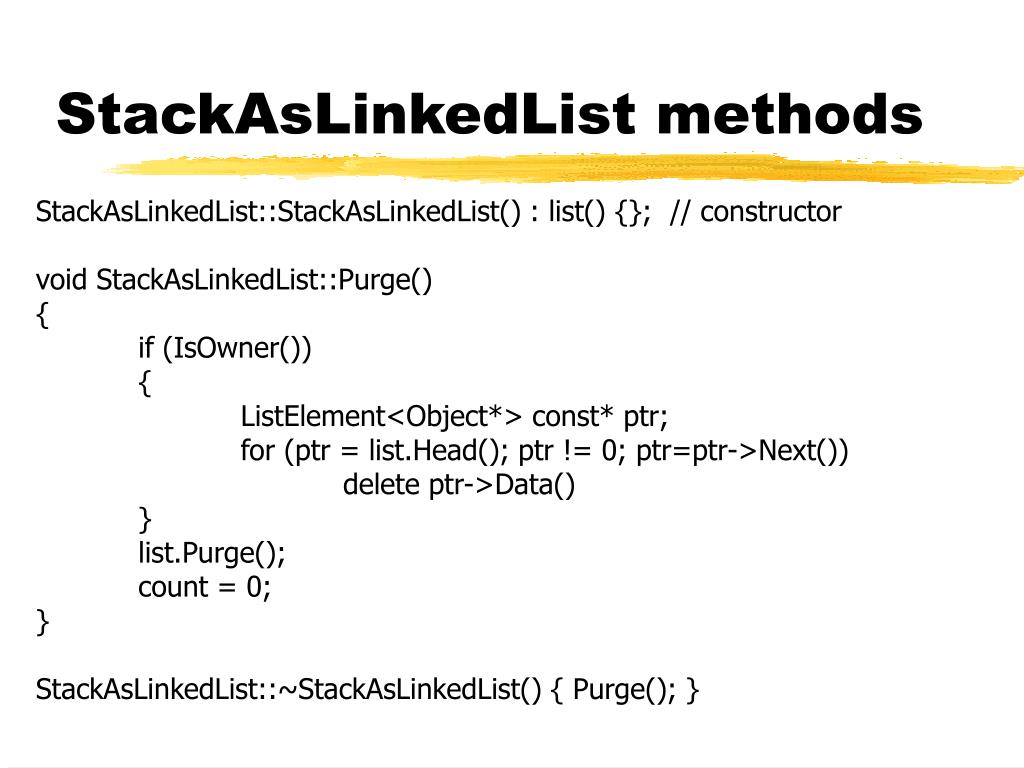 StackAsLinkedList methods StackAsLinkedList::StackAsLinkedList() : list() {}; // constructor void StackAsLinkedList::Purge() { if (IsOwner()) { ListElement<Object*> const* ptr; for (ptr = list.Head(); ptr != 0; ptr=ptr->Next()) delete ptr->Data() } list.Purge(); count = 0; } StackAsLinkedList::~StackAsLinkedList() { Purge(); }