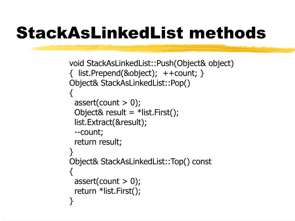 StackAsLinkedList methods void StackAsLinkedList::Push(Object& object) { list.Prepend(&object); ++count; } Object& StackAsLinkedList::Pop() { assert(count > 0); Object& result = *list.First(); list.Extract(&result); --count; return result; } Object& StackAsLinkedList::Top() const { assert(count > 0); return *list.First(); }