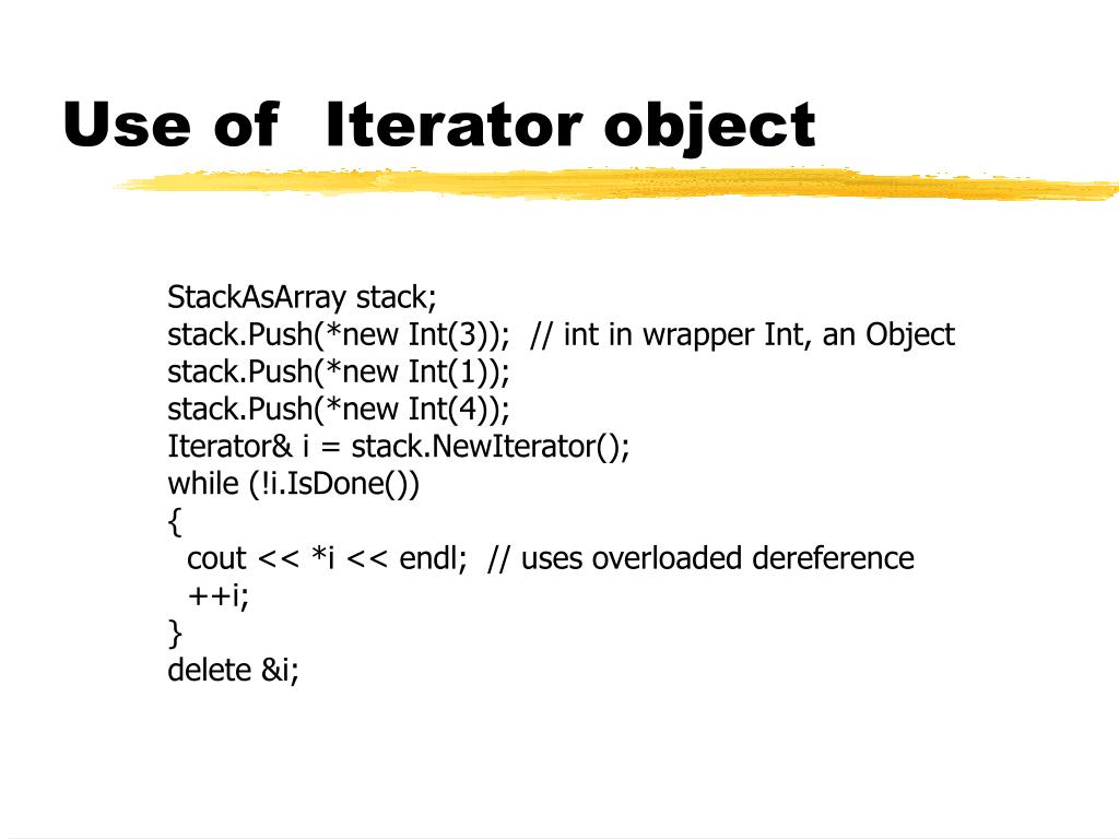 Use of Iterator object StackAsArray stack; stack.Push(*new Int(3)); // int in wrapper Int, an Object stack.Push(*new Int(1)); stack.Push(*new Int(4)); Iterator& i = stack.NewIterator(); while (!i.IsDone()) { cout << *i << endl; // uses overloaded dereference ++i; } delete &i;