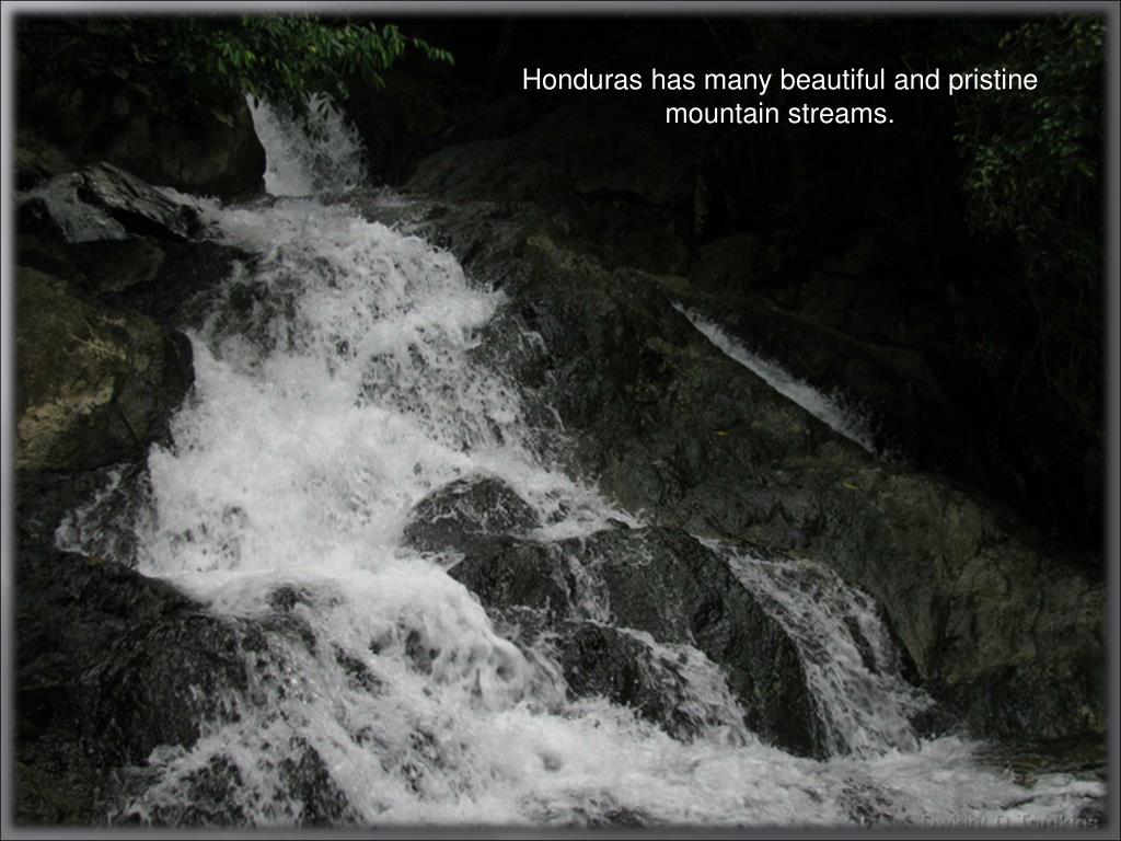 Honduras is a country of great beauty. • It covers about 112,000 square kilometers, making it slightly larger than the state of Virginia. • 80% of the country is mountainous. • The population of Honduras was just over 7 million people in 2008. References: Merrill, T. (Ed.) (1995) Honduras: A Country Study. Washington: GPO for the Library of Congress. Retrieved from http://countrystudies.us/honduras/34.htm The World Bank Group (2010). Data Finder. Retrieved from http://datafinder.worldbank.org/
