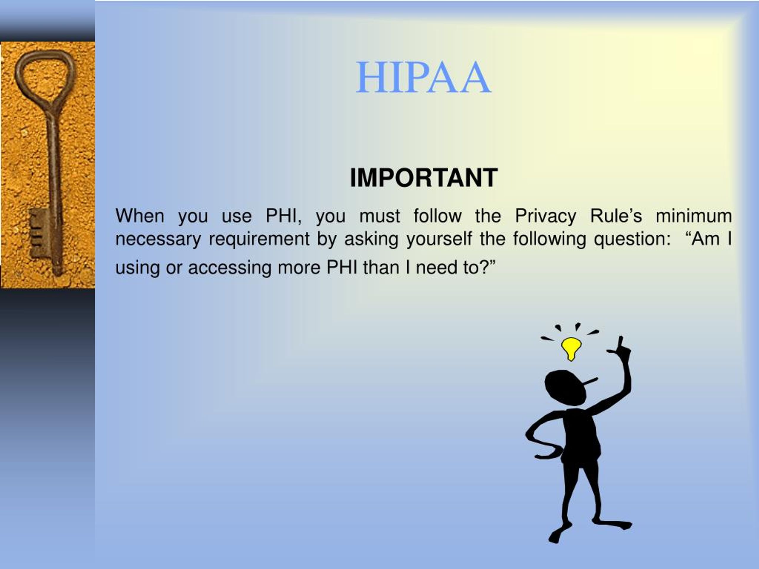 HIPAA IMPORTANT When you use PHI, you must follow the Privacy Rule’s minimum necessary requirement by asking yourself the following question: “Am I using or accessing more PHI than I need to?”