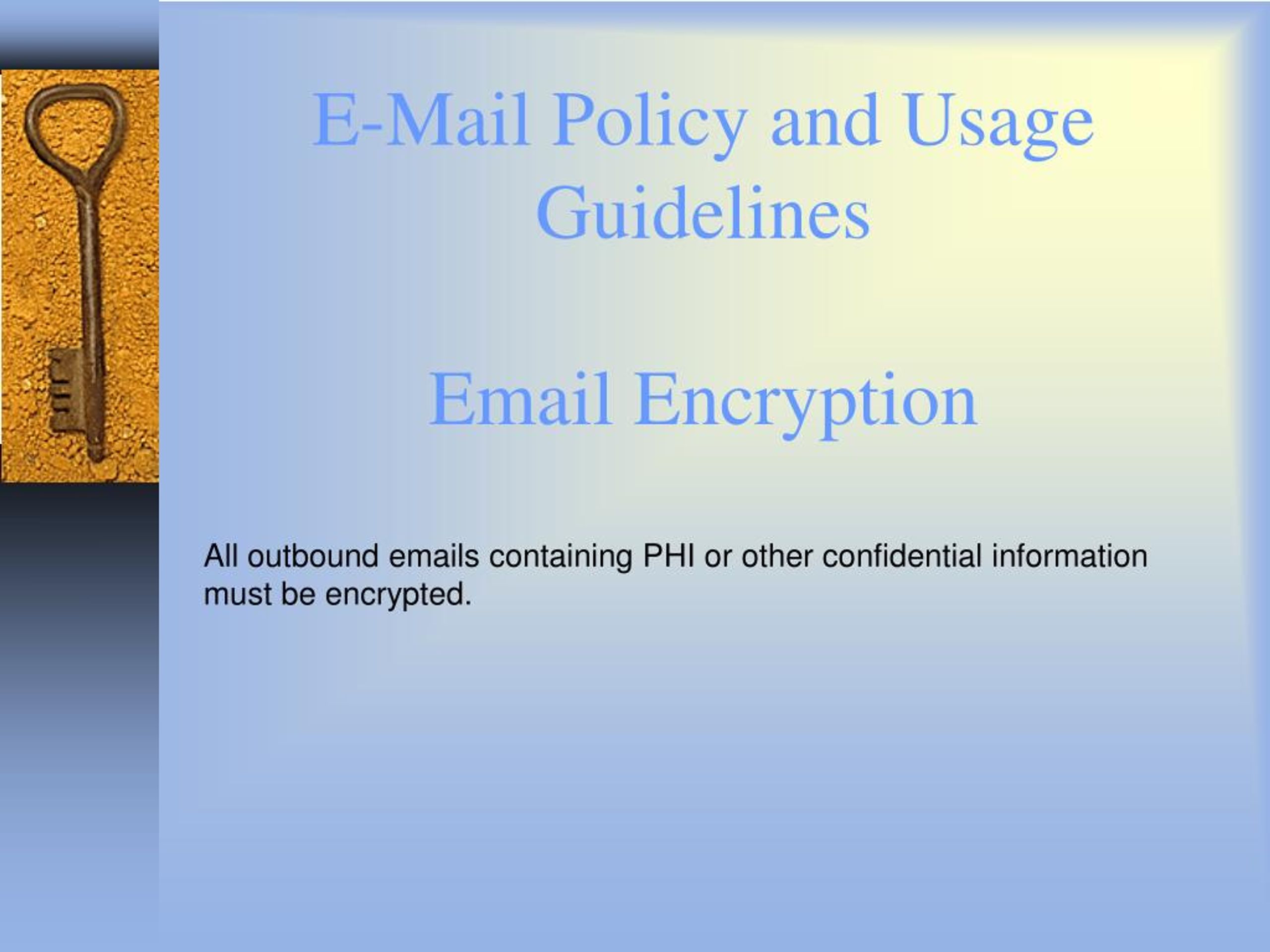E-Mail Policy and Usage Guidelines Email Encryption All outbound emails containing PHI or other confidential information must be encrypted.