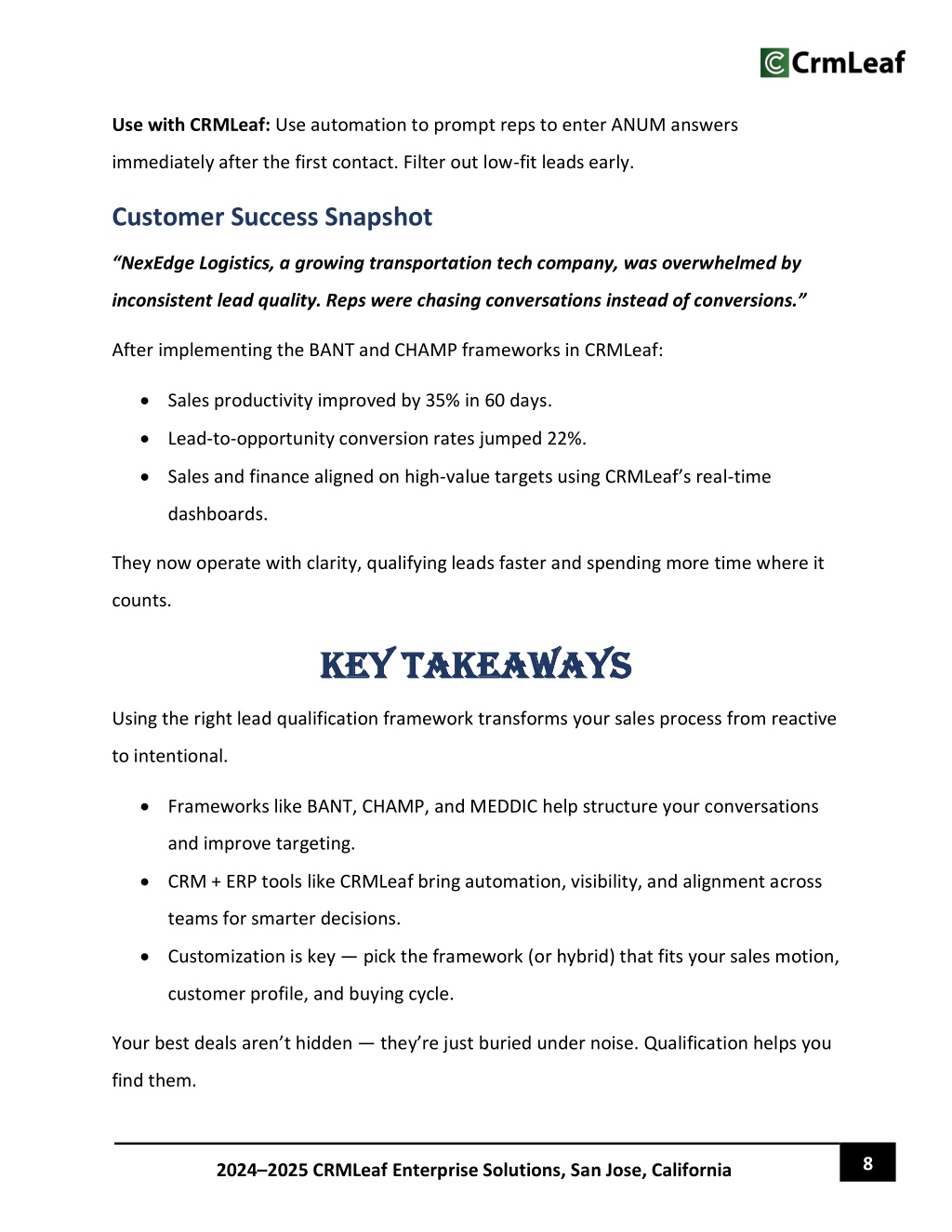 Use with CRMLeaf: Use automation to prompt reps to enter ANUM answers immediately after the first contact. Filter out low-fit leads early. Customer Success Snapshot “NexEdge Logistics, a growing transportation tech company, was overwhelmed by inconsistent lead quality. Reps were chasing conversations instead of conversions.” After implementing the BANT and CHAMP frameworks in CRMLeaf: Sales productivity improved by 35% in 60 days. Lead-to-opportunity conversion rates jumped 22%. Sales and finance aligned on high-value targets using CRMLeaf’s real-time dashboards. They now operate with clarity, qualifying leads faster and spending more time where it counts. Key Takeaways Key Takeaways Using the right lead qualification framework transforms your sales process from reactive to intentional. Frameworks like BANT, CHAMP, and MEDDIC help structure your conversations and improve targeting. CRM + ERP tools like CRMLeaf bring automation, visibility, and alignment across teams for smarter decisions. Customization is key — pick the framework (or hybrid) that fits your sales motion, customer profile, and buying cycle. Your best deals aren’t hidden —they’re just buried under noise. Qualification helps you find them. 8 2024–2025 CRMLeaf Enterprise Solutions, San Jose, California