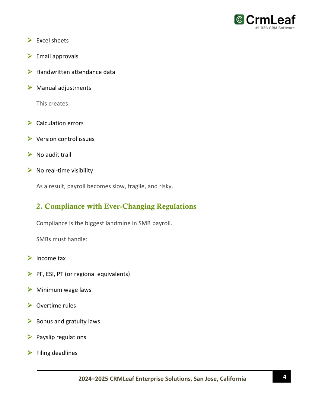 4.  Excel sheets  Email approvals  Handwritten attendance data  Manual adjustments This creates:  Calculation errors  Version control issues  No audit trail  No real-time visibility As a result, payroll becomes slow, fragile, and risky. 2. Compliance with Ever-Changing Regulations Compliance is the biggest landmine in SMB payroll. SMBs must handle:  Income tax  PF, ESI, PT (or regional equivalents)  Minimum wage laws  Overtime rules  Bonus and gratuity laws  Payslip regulations  Filing deadlines 4 2024–2025 CRMLeaf Enterprise Solutions, San Jose, California