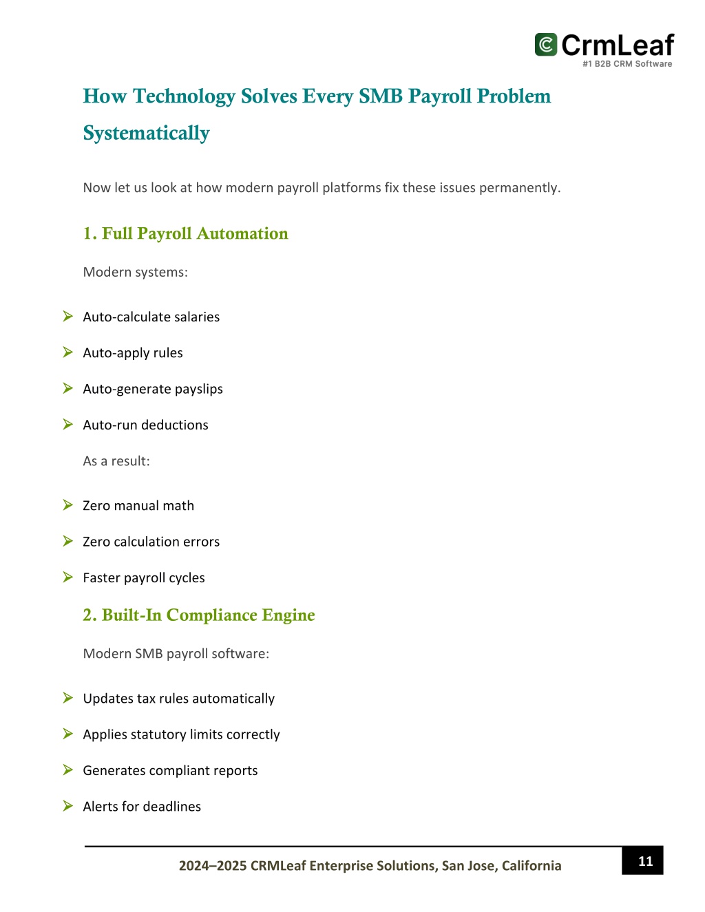 11. How Technology Solves Every SMB Payroll Problem Systematically Now let us look at how modern payroll platforms fix these issues permanently. 1. Full Payroll Automation Modern systems:  Auto-calculate salaries  Auto-apply rules  Auto-generate payslips  Auto-run deductions As a result:  Zero manual math  Zero calculation errors  Faster payroll cycles 2. Built-In Compliance Engine Modern SMB payroll software:  Updates tax rules automatically  Applies statutory limits correctly  Generates compliant reports  Alerts for deadlines 11 2024–2025 CRMLeaf Enterprise Solutions, San Jose, California
