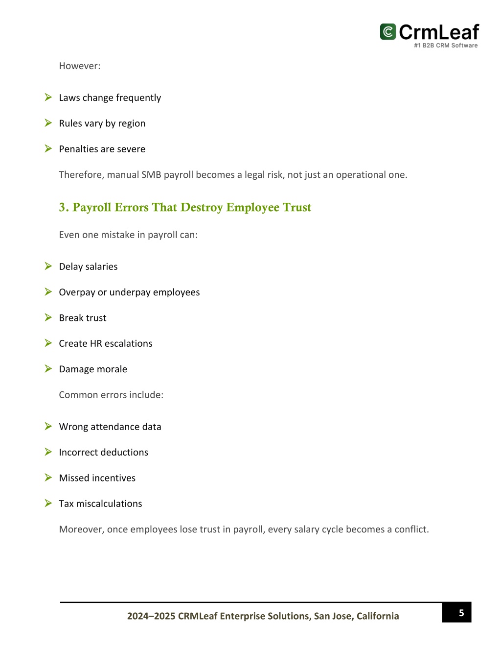 5. However:  Laws change frequently  Rules vary by region  Penalties are severe Therefore, manual SMB payroll becomes a legal risk, not just an operational one. 3. Payroll Errors That Destroy Employee Trust Even one mistake in payroll can:  Delay salaries  Overpay or underpay employees  Break trust  Create HR escalations  Damage morale Common errors include:  Wrong attendance data  Incorrect deductions  Missed incentives  Tax miscalculations Moreover, once employees lose trust in payroll, every salary cycle becomes a conflict. 5 2024–2025 CRMLeaf Enterprise Solutions, San Jose, California
