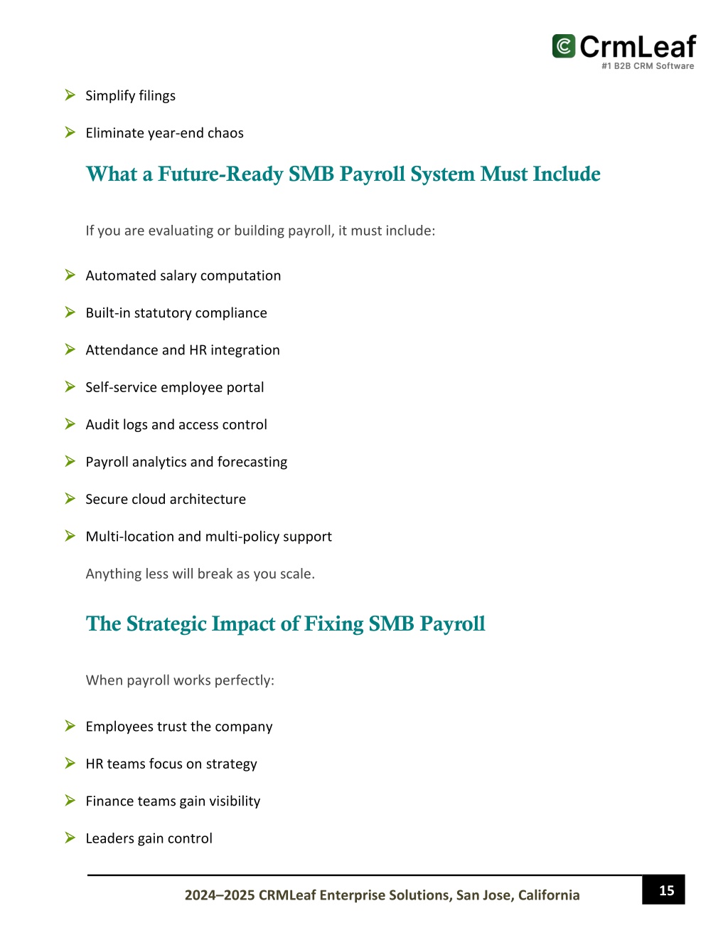 15.  Simplify filings  Eliminate year-end chaos What a Future-Ready SMB Payroll System Must Include If you are evaluating or building payroll, it must include:  Automated salary computation  Built-in statutory compliance  Attendance and HR integration  Self-service employee portal  Audit logs and access control  Payroll analytics and forecasting  Secure cloud architecture  Multi-location and multi-policy support Anything less will break as you scale. The Strategic Impact of Fixing SMB Payroll When payroll works perfectly:  Employees trust the company  HR teams focus on strategy  Finance teams gain visibility  Leaders gain control 15 2024–2025 CRMLeaf Enterprise Solutions, San Jose, California