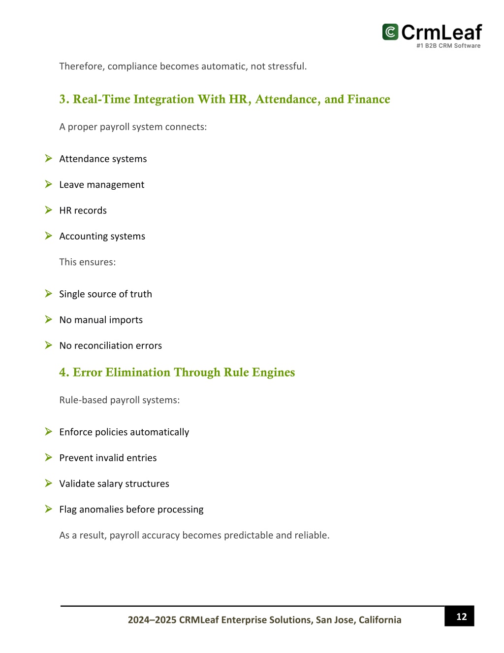 12. Therefore, compliance becomes automatic, not stressful. 3. Real-Time Integration With HR, Attendance, and Finance A proper payroll system connects:  Attendance systems  Leave management  HR records  Accounting systems This ensures:  Single source of truth  No manual imports  No reconciliation errors 4. Error Elimination Through Rule Engines Rule-based payroll systems:  Enforce policies automatically  Prevent invalid entries  Validate salary structures  Flag anomalies before processing As a result, payroll accuracy becomes predictable and reliable. 12 2024–2025 CRMLeaf Enterprise Solutions, San Jose, California
