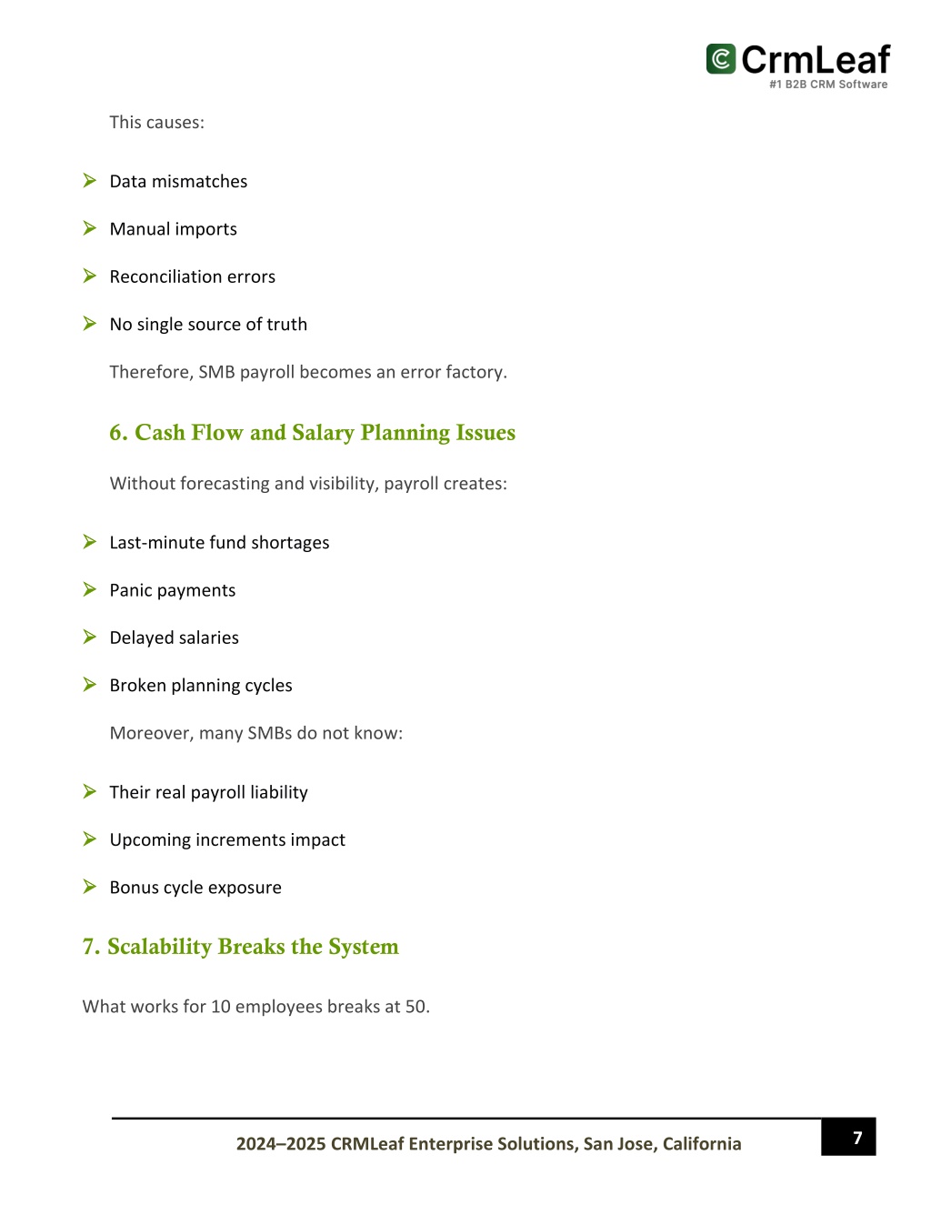7. This causes:  Data mismatches  Manual imports  Reconciliation errors  No single source of truth Therefore, SMB payroll becomes an error factory. 6. Cash Flow and Salary Planning Issues Without forecasting and visibility, payroll creates:  Last-minute fund shortages  Panic payments  Delayed salaries  Broken planning cycles Moreover, many SMBs do not know:  Their real payroll liability  Upcoming increments impact  Bonus cycle exposure 7. Scalability Breaks the System What works for 10 employees breaks at 50. 7 2024–2025 CRMLeaf Enterprise Solutions, San Jose, California