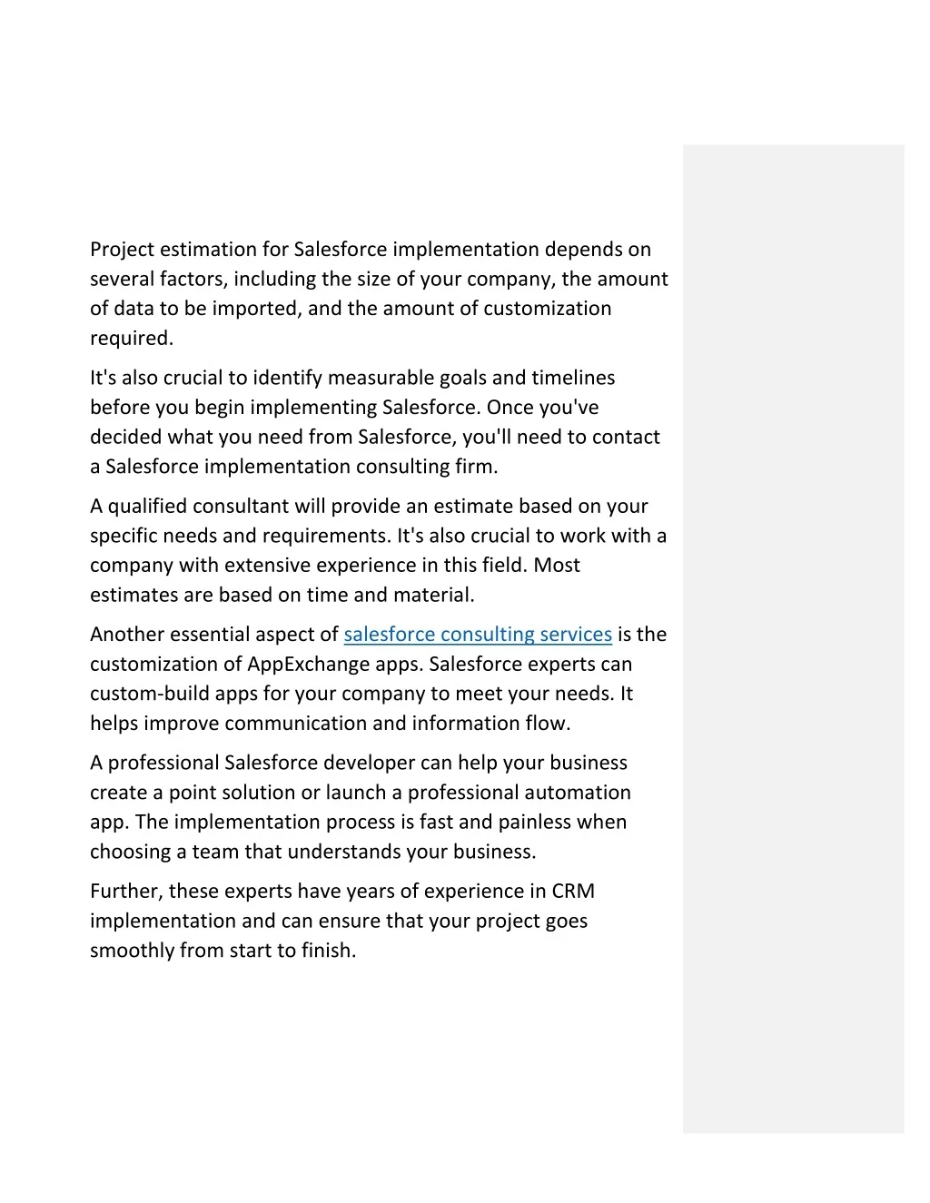 fees and changing user interfaces, our Salesforce consultants can help you get the most out of Salesforce. There are many benefits to hiring these professionals for your project, and here are some of the most common ones: A consultant with years of experience typically performs these implementation services. They specialize in the Salesforce ecosystem and have deep knowledge of the product. They'll also help you map business processes to the system and offer on-site training and support for the entire process. They'll even help you with an assessment of your org. Unlike in-house Salesforce professionals, Salesforce implementation services consultants are experienced and passionate about the platform. And because of that, they are the best choice for your company.