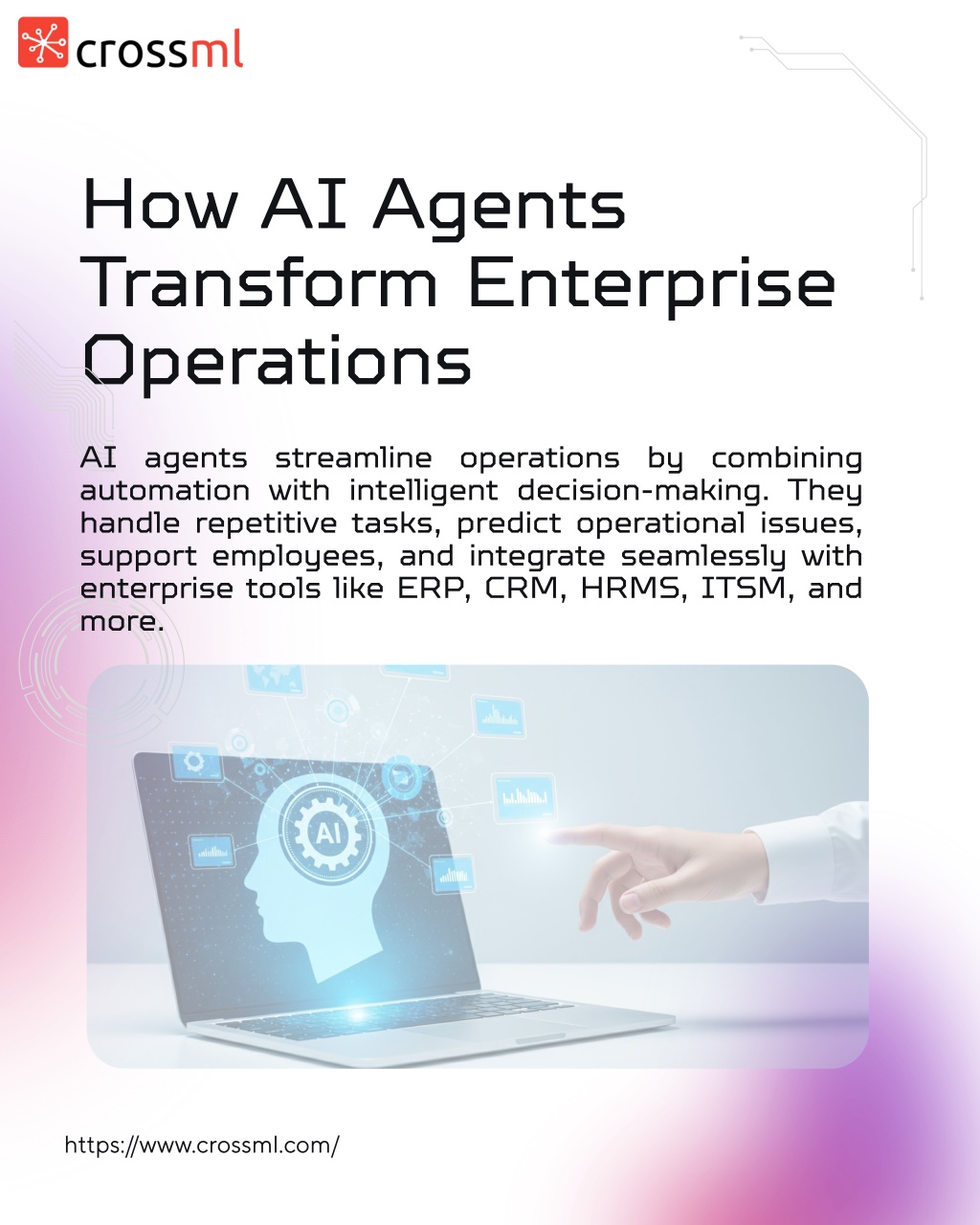 How AI Agents Transform Enterprise Operations AI agents streamline operations by combining automation with intelligent decision-making. They handle repetitive tasks, predict operational issues, support employees, and integrate seamlessly with enterprise tools like ERP, CRM, HRMS, ITSM, and more. https://www.crossml.com/